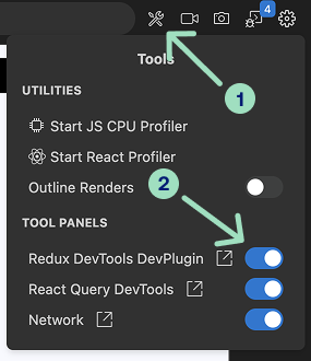 The built-in tools for Network Inspector, Redux, Outline Renders (via react-scan) and React Query are integrated with the IDE and doesn't require any additional configuration.